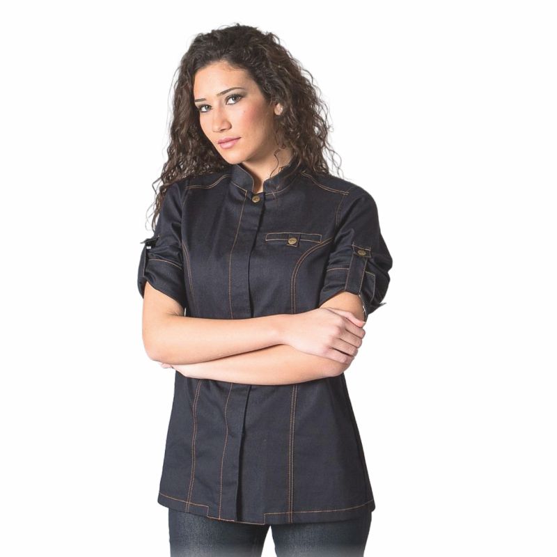 La chaqueta unisex presenta un diseño de alta costura con manga larga tipo roll up con corchete y un cierre central mediante botones de presión ocultos, con el primero de ellos visible. El cuello tirilla agrega un toque de elegancia, mientras que los puños vueltos proporcionan versatilidad. El bolsillo en el pecho izquierdo proporciona un espacio práctico para guardar pequeños objetos, y los botones de presión ocultos garantizan un cierre seguro y sin complicaciones. El modelo ajustado de la chaqueta, combinado con costadillos en el delantero y la espalda, resalta la figura de la mujer, ofreciendo un aspecto profesional y elegante.