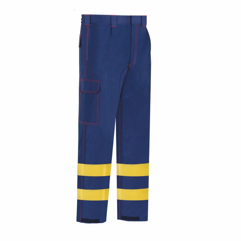 Cierre con cremallera. Goma en la cintura. Ajuste en tobillos con velcro. Refuerzo en entrepiernas. Dos bandas reflectantes amarillas en contorno de perneras. Bolsillos: Dos delanteros. Dos traseros con tapeta y velcro. Dos tipo militar en perneras.