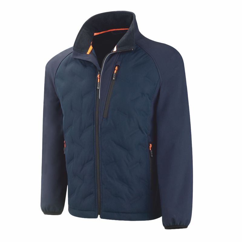 Chaqueta híbrida, triple lámina en brazos y costados y tipo pluma en talle delantero y trasero. La manga es ranglan para facilitar el movimiento de los brazos. Los puños se ajustan con ribete elástico. En la cadera lleva dos bolsillos de apertura vertical con cierre de cremallera. Cierre central con cremallera negra de poliéster. Costuras interiores ribeteadas en raso. Es una chaqueta para protegerse del viento, del frío y de la humedad. Es especial para trabajadores que desarrollan su trabajo en horario nocturno y exteriores y en lugares con altos contrastes de temperatura.