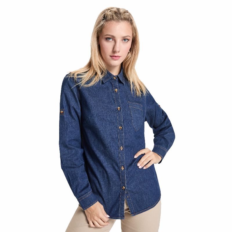 Camisa vaquera manga larga con trabilla ajustable mujer. Tejido stretch. Cintura ligeramente ajustada. Cuello camisero. Costura adelantada en hombros y canesú trasero. Bolsillo en pico pecho izquierdo. Puños con abotonadura doble y pinzas al lado de la tapeta de puño con un botón más pequeño. Pinzas de pecho y espalda. Bajos redondeados.