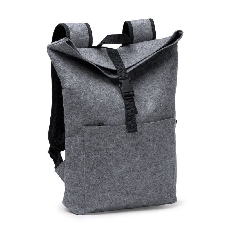 Mochila con solapa elaborada en fieltro reciclado. Cuenta con mosquetón para cierre del compartimento principal, bolsillo frontal para guardar pequeñas pertenencias y asas ajustables.