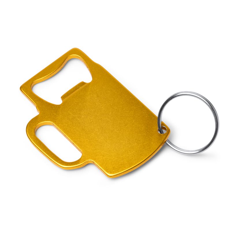 Llavero abridor elaborado en aluminio reciclado con diseño en forma de jarra de cerveza.