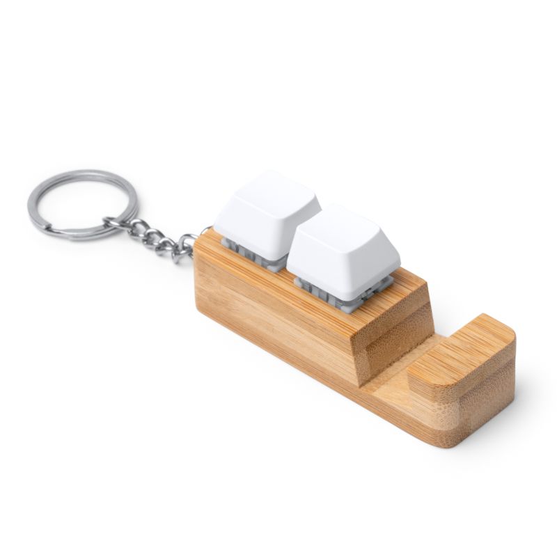 Llavero elaborado en bambú con soporte para smartphone y función antiestrés. Su diseño cuenta con botones tipo teclado en blanco que pueden pulsarse y utilizarse como medio antiestrés.
