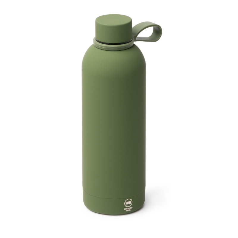Bidón térmico de acero inoxidable 304 reciclado. Capacidad 500ml. Acabado tacto goma. Incluye asa de transporte de silicona. Tapa y asa a conjunto. Presentación en caja diseño eco.