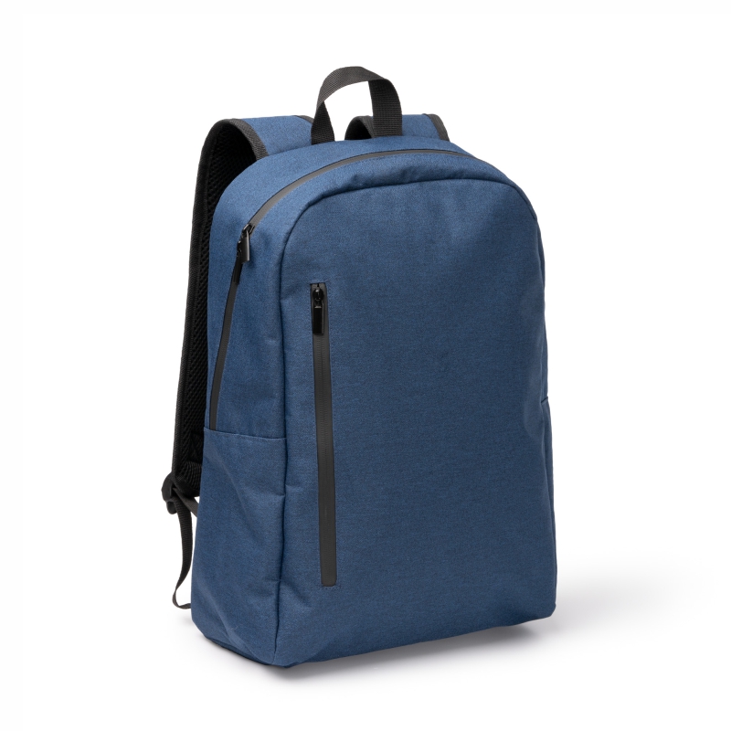 Mochila elaborada en RPET 300D con revestimiento en PVC repelente al agua. Cierre con doble cremallera hermética. Compartimento principal con bolsillo para portátil de 15". Detalle reflectante en asas. Espalda y asas acolchadas. Cinta para troley. Espalda y asas acolchadas.
