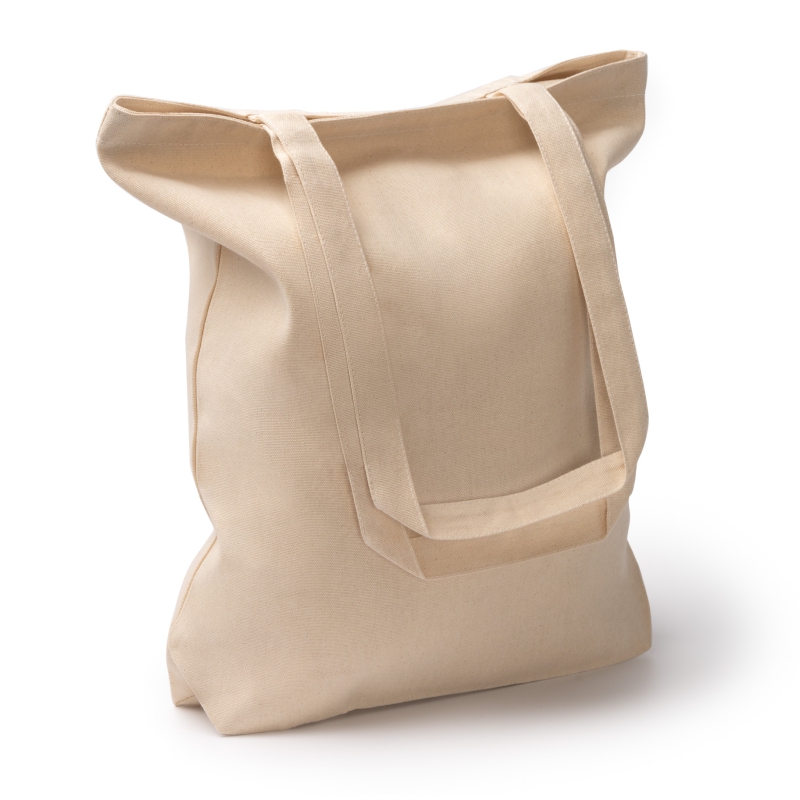 Bolsa 100% algodón 230 g/m² con fuelle en la base. Asas largas de 70 cm. Cierre con cremallera.