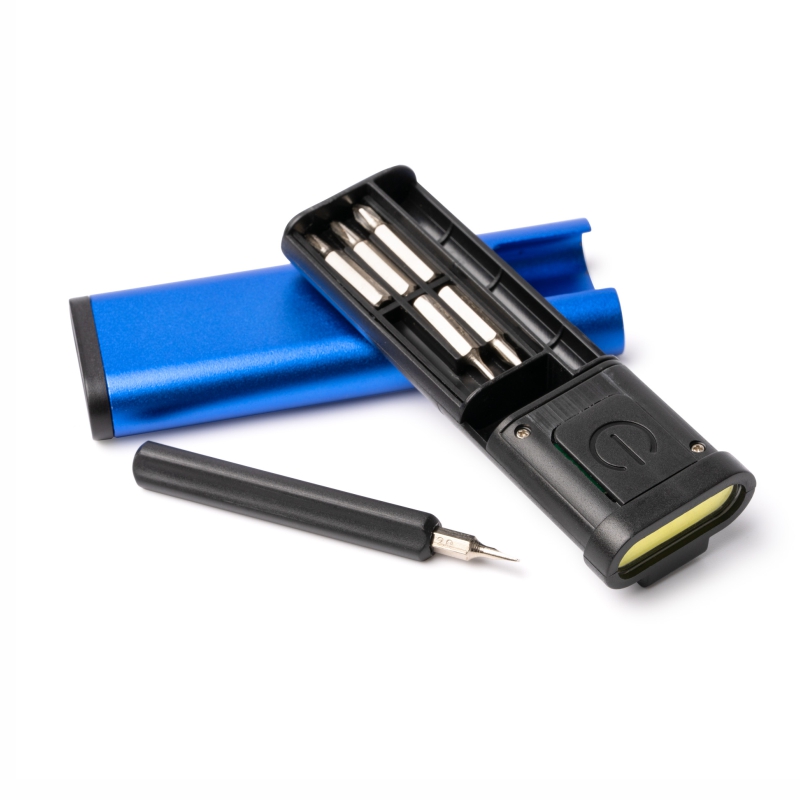 Linterna multifunción elaborada en aluminio. Con destornillador y puntas intercambiables en el interior. 2 pilas de botón CR2025 incluidas. Presentacion en caja blanca.