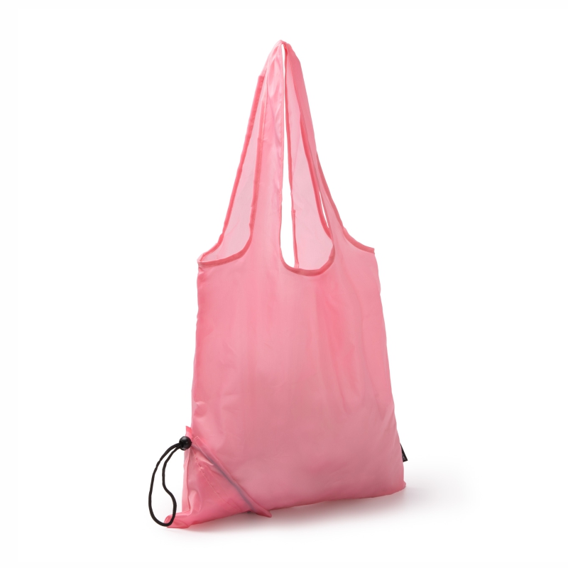Bolsa de compra en RPET 190T . Plegable en su esquina inferior en forma de triángulo. Cierre de cordón ajustable. Asas cortas.
