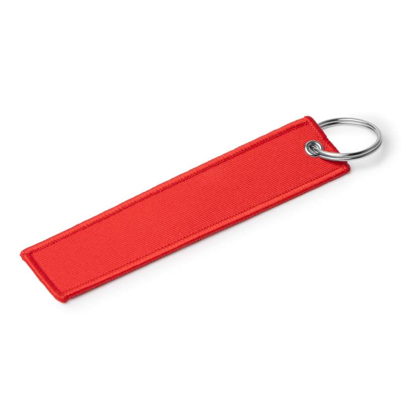 Llavero rectangular elaborado en tejido RPET, con ojal y anilla metálica.