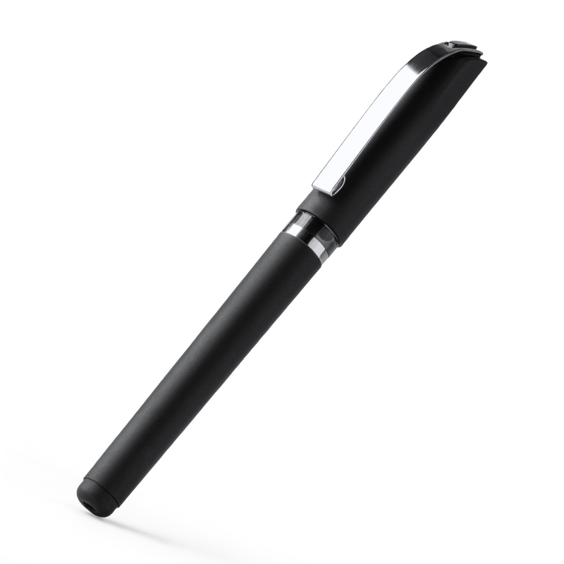 Bolígrafo roller con cuerpo de ABS tacto goma. Acabado mate y detalles metalizados. Carga jumbo de tinta gel azul.