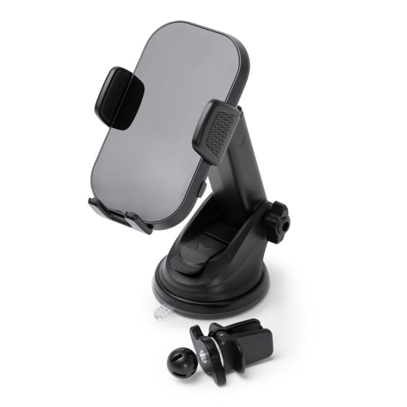 Soporte de coche para smartphone 2 en 1 con carga inalámbrica. Brazo extensible con ventosa y accesorio para rejilla ajustable incluidos. Ajuste lateral automático. Compatible con dispositivos con tecnología de carga inalámbrica. Potencia 15W. Presentación en caja diseño.