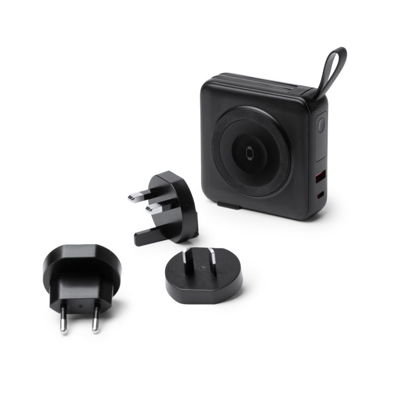 Batería externa 3 en 1 de 10.000mAh elaborada en ABS. Potencia 15W. Carga inalámbrica hasta 3 dispositivos. 3 adaptadores de viaje para corriente eléctrica. Indicador de porcentaje de carga. Puertos Tipo C y USB. Cables Lightning y Tipo C incorporados. Asa de transporte. Presentación en caja diseño.