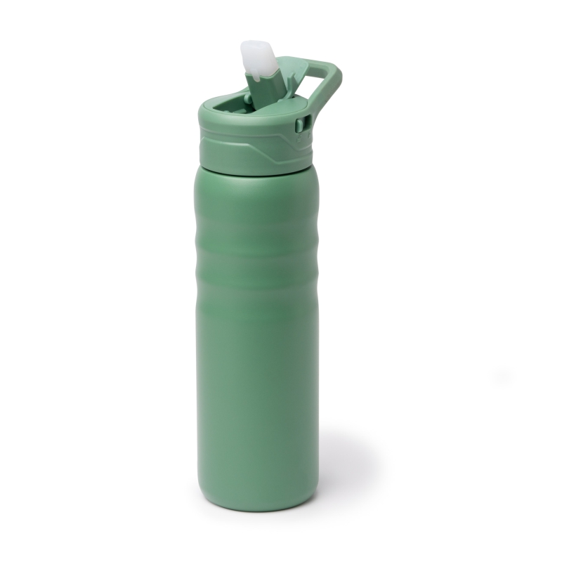 Bidón elaborado en acero inoxidable reciclado 304 de doble capa. Capacidad 710 ml. Pajita abatible de silicona con botón de apertura y bloqueo de seguridad. Asa de transporte. Presentación en caja diseño eco.