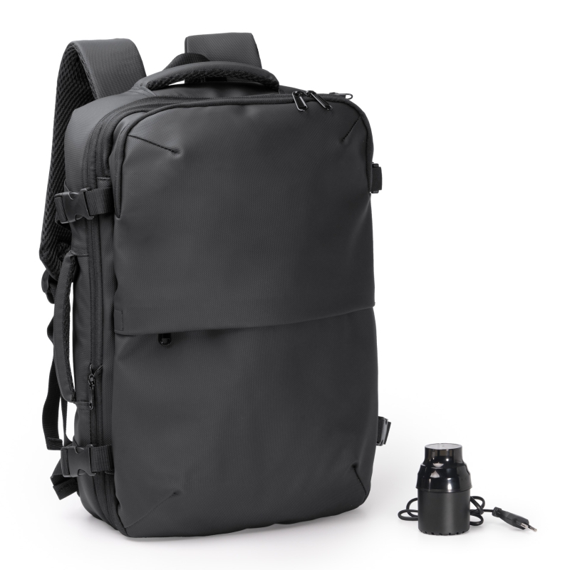 Mochila de PU Leather con compresión al vacío. Bomba de vacio de 30W incluida. Compartimento principal con bolsillo en tejido de rejilla. Bolsillo frontal invisible. Compartimento para portátil de hasta 17". Cinta para trolley. Espalda y asas acolchadas.