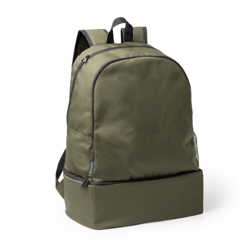 Mochila deportiva elaborada en RPET 600D con bolsillo zapatillero en la parte inferior. Espalda y asas acolchadas.