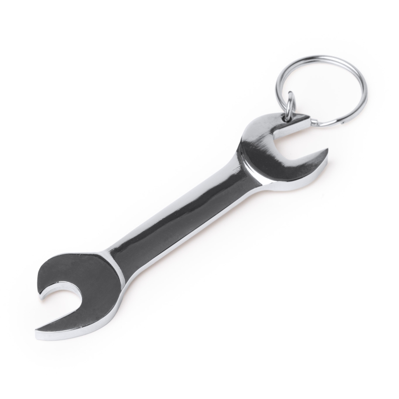 Llavero metálico con forma de llave inglesa. Función abridor. Presentación en sobre kraft.